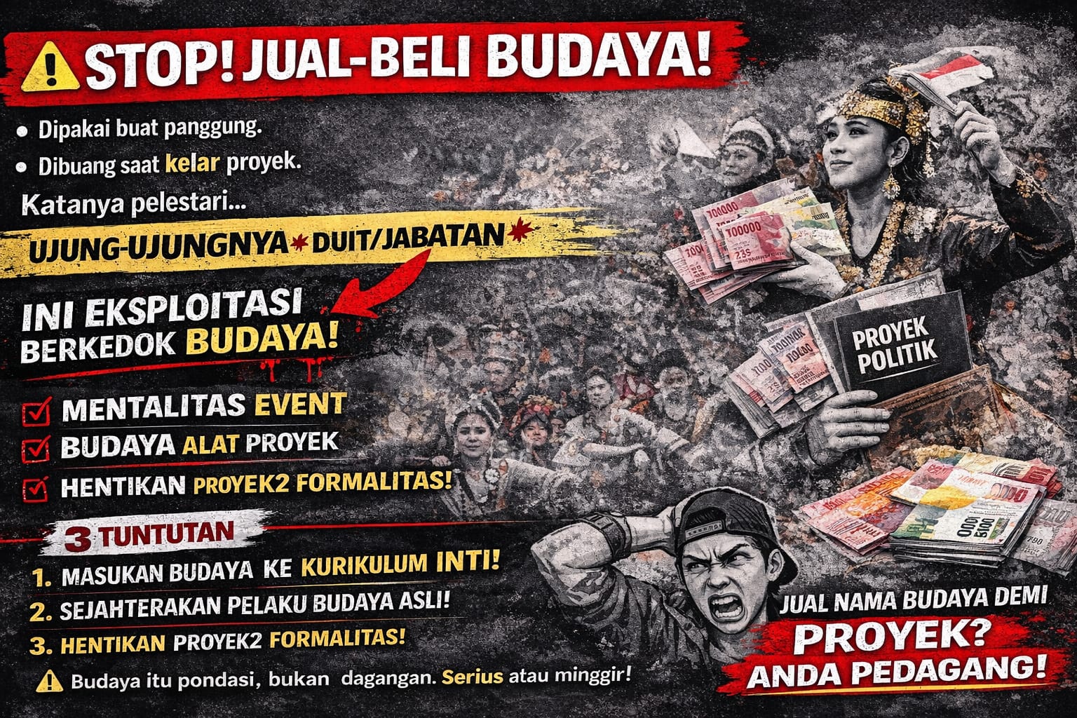Kritik keras dilayangkan terhadap fenomena ‘pedagang budaya’. Warisan mulia leluhur kini kerap terjebak dalam transaksi materi dan eksploitasi politik demi keuntungan sesaat. Budaya telah kehilangan jiwanya karena hanya dihitung berdasarkan nilai ekonomi, bukan nilai spiritual dan historis.